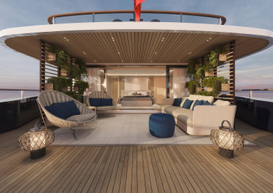 The upper deck features the captain’s cabin, wheelhouse, day head and a second guest saloon, leading out to the upper aft deck with seating and sun loungers. Moving up a level the sundeck is perfect for relaxing and enjoying stunning surroundings, with a large al fresco dining set up, sun loungers, seating and coffee table and a beautiful Jacuzzi. The lower deck provides yet more exterior space with the lazarette, swim platform and connecting tender garage that has the capacity to store a tender up to 7 metres long. The impressive beach club area has been further developed with additional openings that provide even more of a connection with the sea.